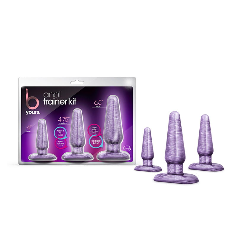 Blush is a sexual health brand committed to the pursuit of pleasure with innovation education and inclusivity. Our mission is to enhance intimacy with thoughtful products designed to celebrate all bodies. Ready to dive into anal exploration? The B Yours Anal Trainer Kit will help your body safely acclimate to larger lengths and girth! Start small and work your way up to large with three flexible and beautiful plugs. Each plug is tapered for comfortable insertion and is equipped with a strong neck to hold it in place and a flexible base for anal safety. Made with body-safe smooth PVC this Anal Trainer Kit is phthalate free fragrance free latex free and easy to clean! Add some lube and take these gorgeous plugs on an adventure! As with all products and/or materials at Blush it has been 3rd party lab tested to meet or exceed REACH and Prop 65 safety compliance directives. It's your body. Be mindful of what you put in it.