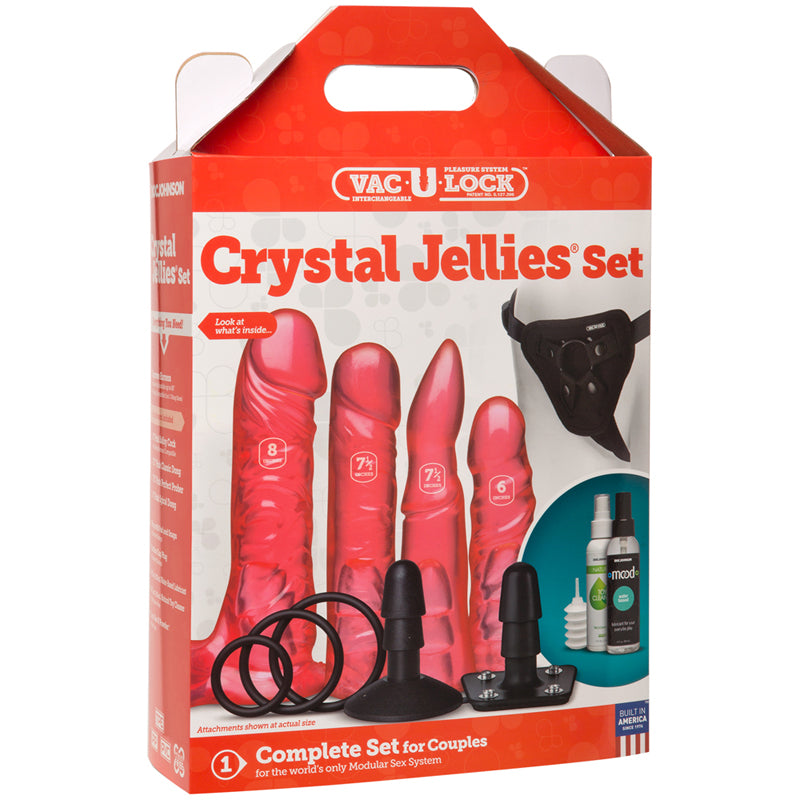 A burst of color makes your play time pop with the Vac-U-Lock Crystal Jellies Set. This deluxe strap-on kit gets your play going in a snap with a complete harness including removable o-rings and the patented Vac-U Plug four distinct and exciting Crystal Jellies Vac-U-Lock attachments in translucent pink. Attachments can be used with the harness the included Vac-U-Lock suction cup and any other accessory or harness in the line.